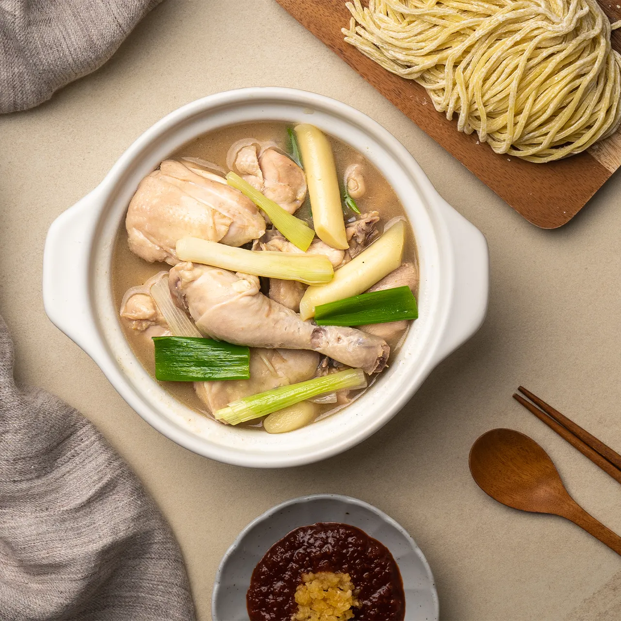 국내산 닭, 닭한마리 육수베이스, 밀떡, 다진마늘, 중화면, 대파, 찍먹소스