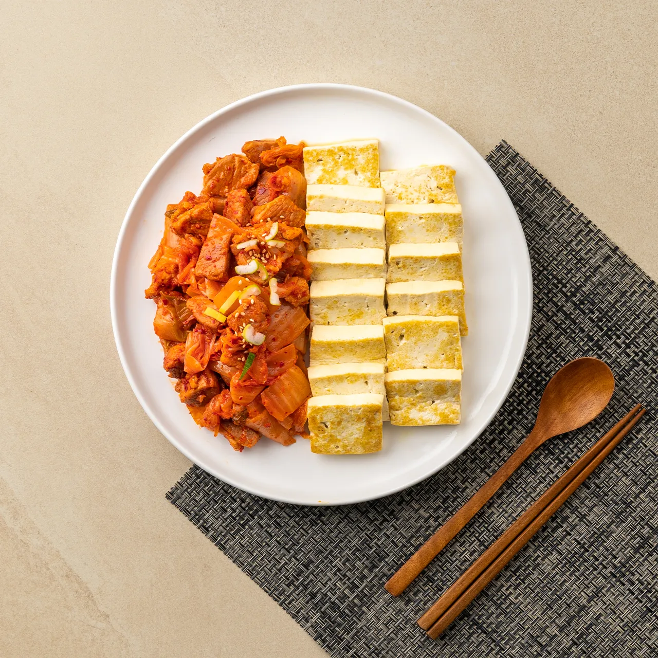 구운 두부 옆으로 고기와 김치를 담아 맛있게 드시면 됩니다.